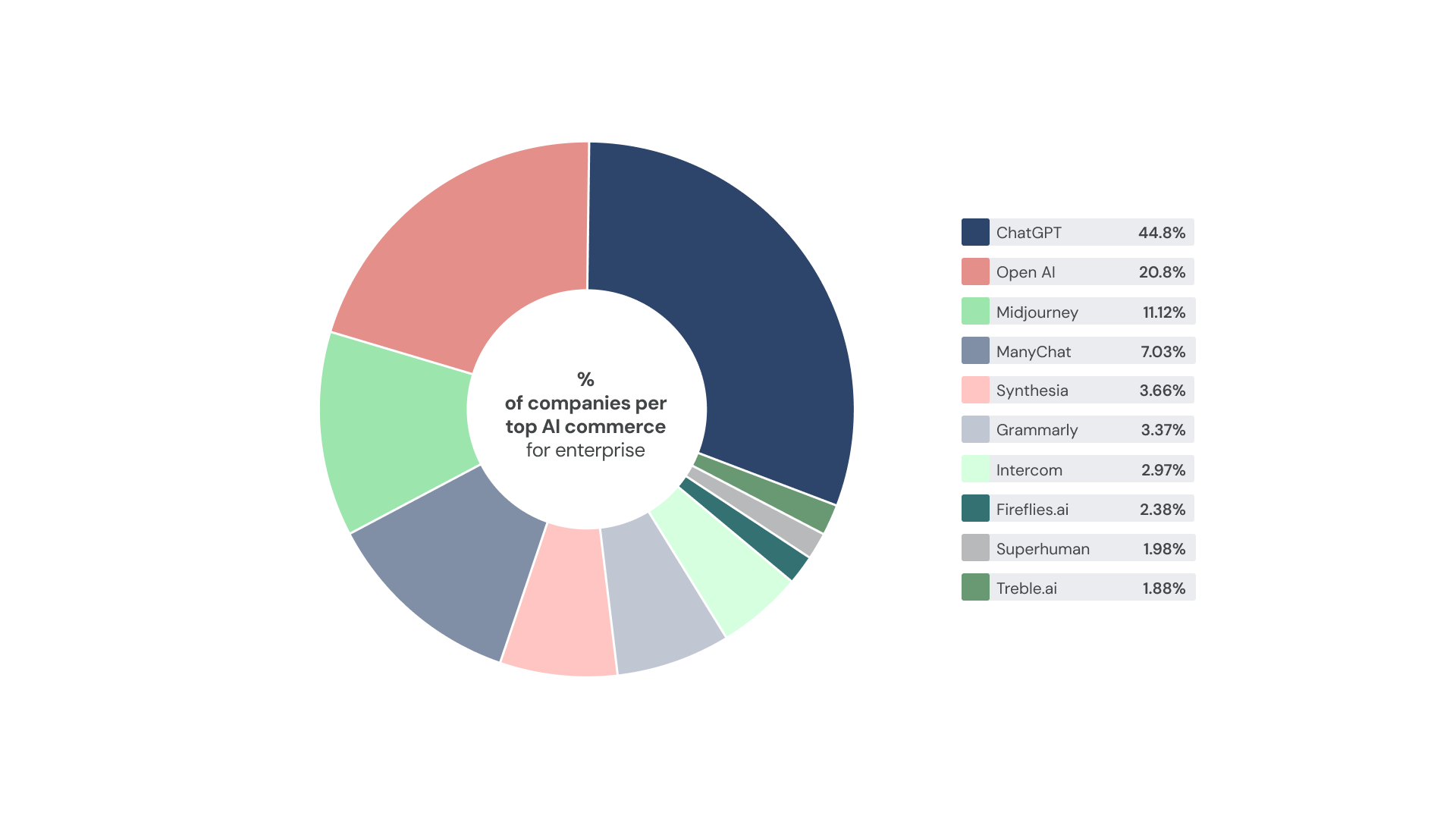 Las compañías Enterprise, por su parte, destinan un 31% del gasto a ChatGPT, un 20,7% a OpenAI y un 12,1% a Grammarly, demostrando que las herramientas de corrección de textos son más usadas en grandes empresas. Le sigue Midjourney con la misma proporción (12,1%). ManyChat se lleva un 6,9% del gasto, al igual que Synthesia.